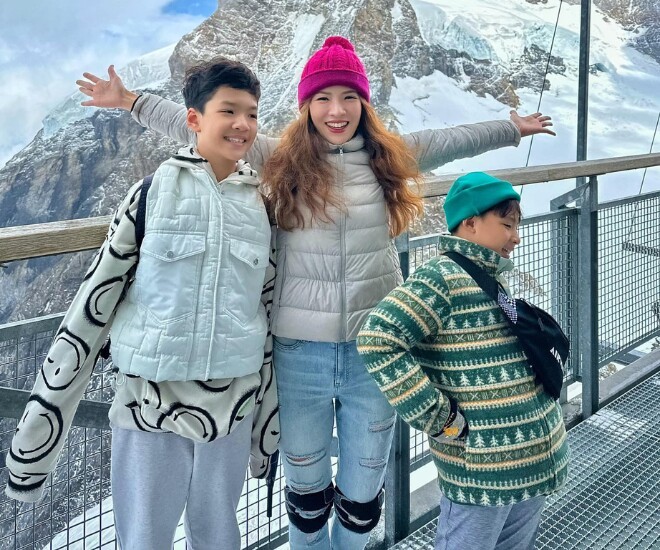 Nữ diễn viên cũng bày tỏ sự bất ngờ khi 2 con trai là Khải Minh và Khải Nguyên trượt tuyết điêu luyện dù đây là lần đầu tiên 2 cậu bé trải nghiệm bộ môn này.