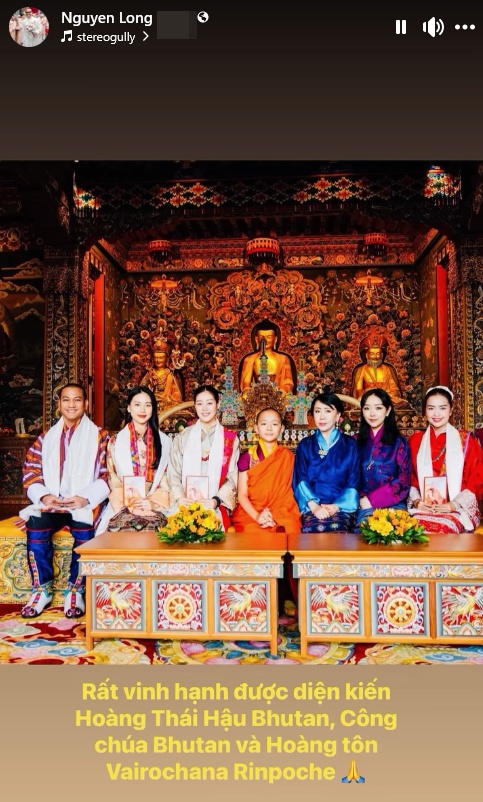 Người đẹp viết: "Một duyên lành hiếm có và vô cùng trân quý khi Hoa được diện kiến Hoàng Thái Hậu, Công Chúa cùng Ngài Tulku Varochana tại Bhutan."