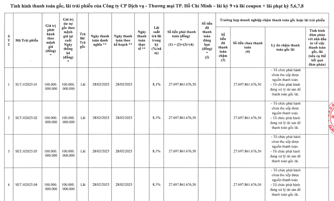 CTCP Dịch vụ - Thương mại TP. HCM (Setra Corp) vừa công bố thông tin liên quan đến tình hình thanh toán gốc và lãi trái phiếu. Theo đó, tính đến ngày 28/2/2025, công ty này đang chậm thanh toán lãi 9 và lãi coupon + lãi phạt kỳ 5,6,7,8 của 20 mã trái phiếu từ SET.H2025.01 đến SET.H2025.20, với tổng số tiền lên tới gần 554 tỷ đồng.