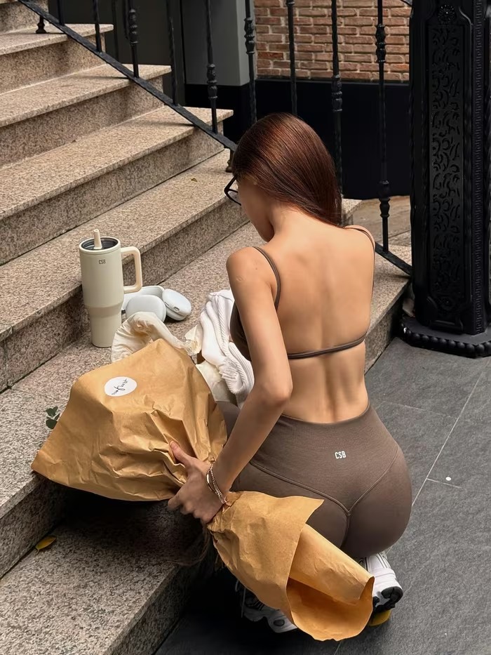 Trong hình, Sĩ Thanh lên đồ gợi cảm với set đồ nâu ôm sát gồm áo croptop và quần legging tựa đồ tập. Thiết kế trễ nải giúp mỹ nhân khoe khéo vòng 1 căng đét cùng vòng eo bé tí và tấm lưng trần nõn nà.