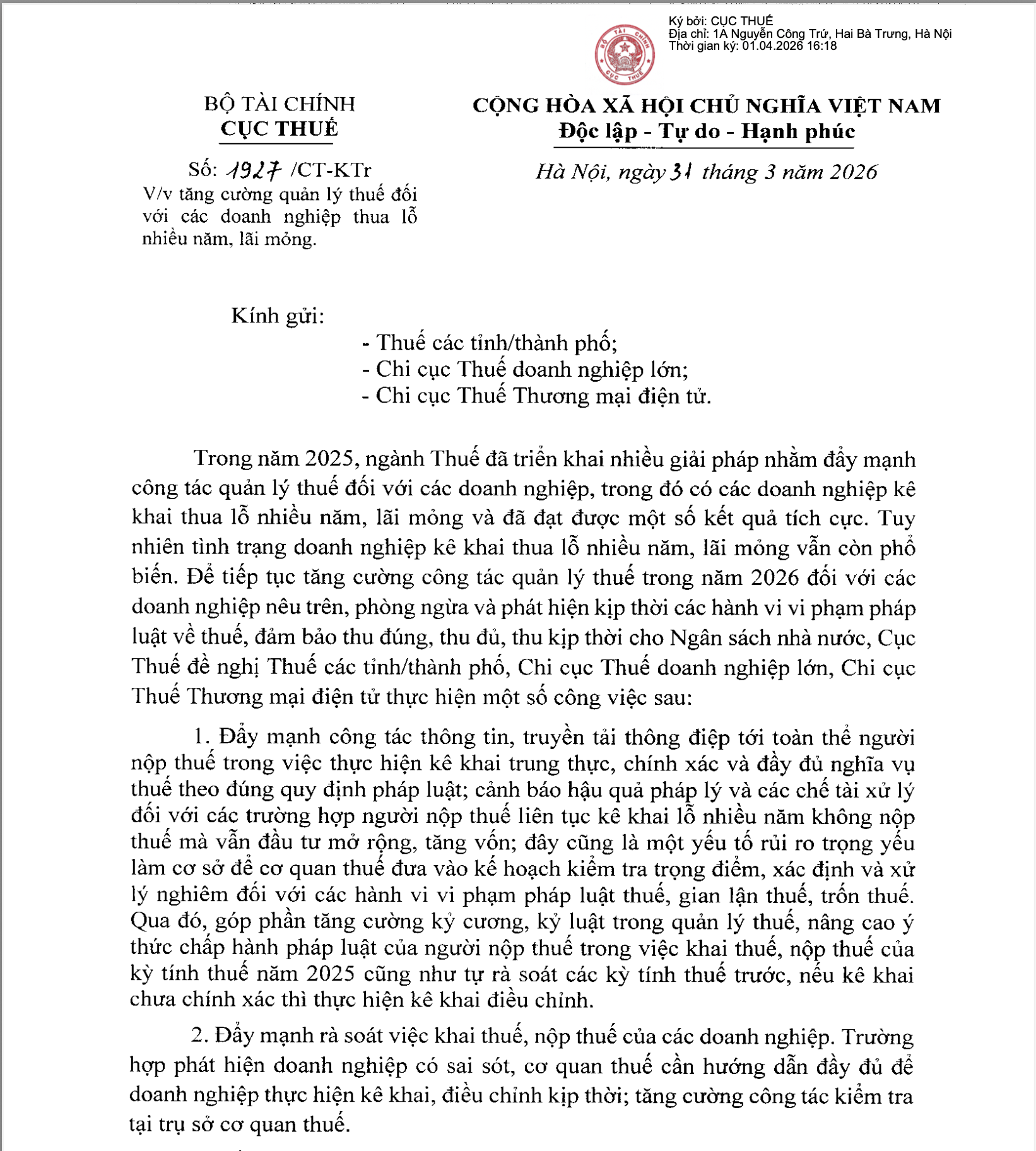 Cục Thuế vừa ban hành Công văn số 1927/CT-KTr, yêu cầu toàn ngành tăng cường quản lý thuế đối với các doanh nghiệp có dấu hiệu thua lỗ kéo dài, lợi nhuận thấp. Động thái này nhằm kịp thời phát hiện, ngăn chặn các hành vi gian lận, trốn thuế, qua đó bảo đảm thu đúng, thu đủ cho ngân sách nhà nước và nâng cao tính minh bạch của môi trường kinh doanh.
