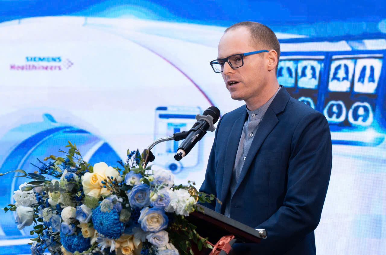 Ông Fabian Martin Singer giới thiệu những ưu điểm vượt trội của hệ thống máy chụp CT Somatom Force VB30. Ảnh: Bệnh viện Đa khoa Tâm Anh