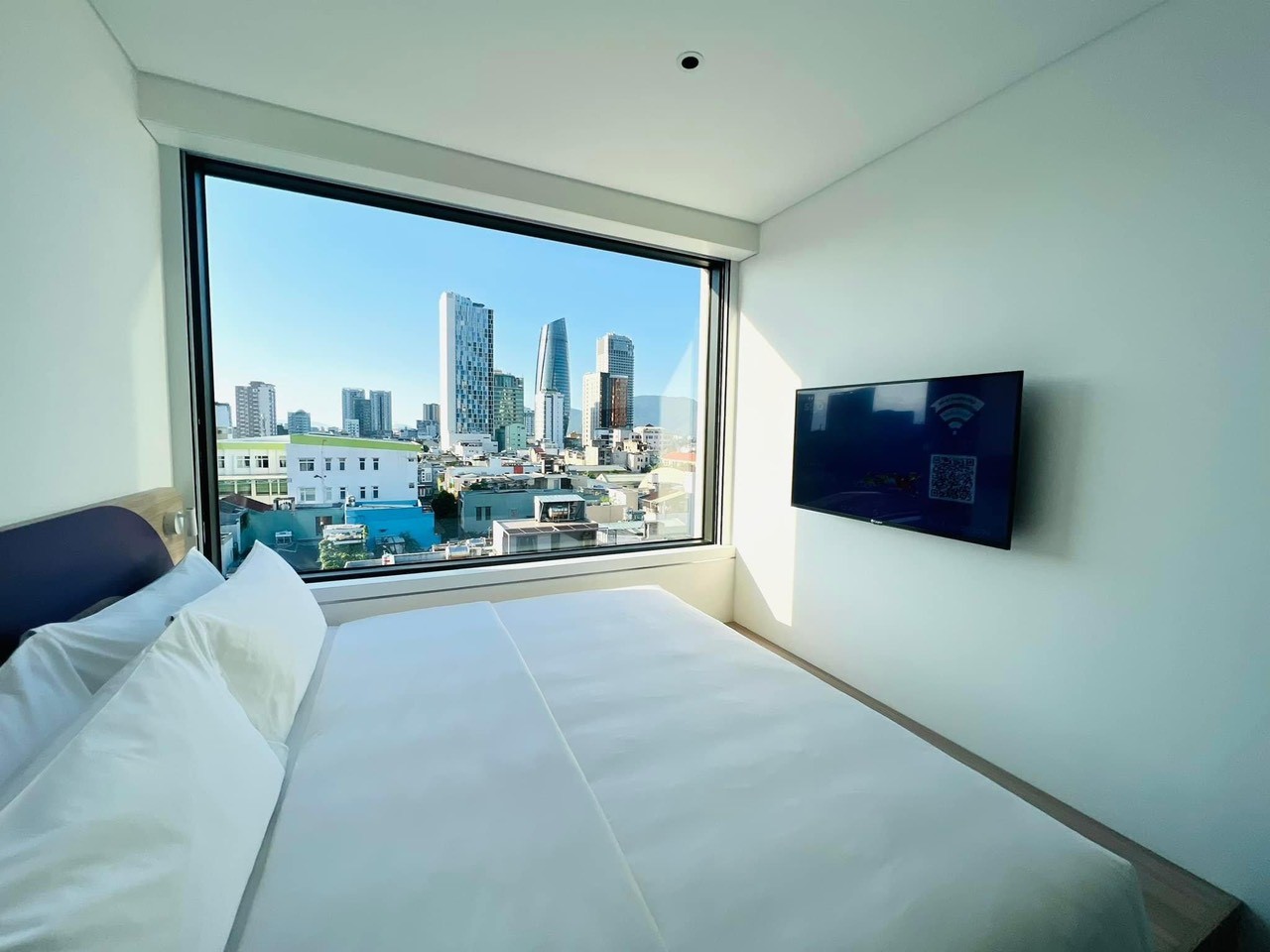 Căn phòng với khung cửa sổ panorama hướng ra thành phố.
