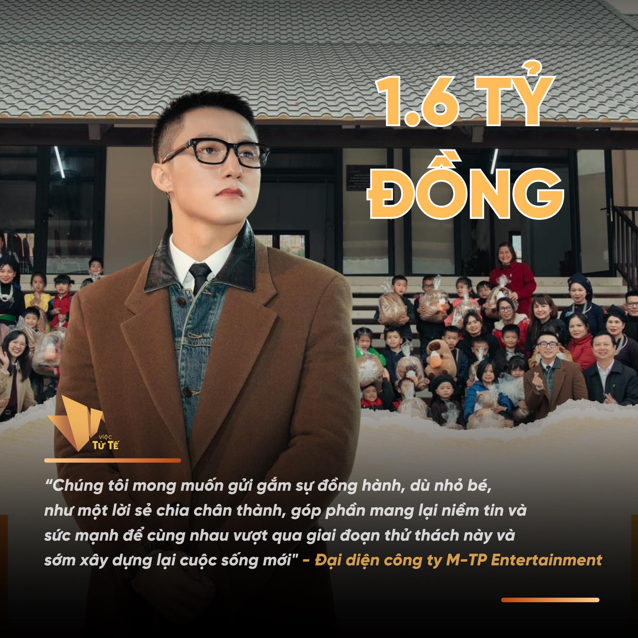 Mới nhất, Sơn Tùng cùng công ty của mình đã ủng hộ số tiền 1,6 tỷ đồng để hỗ trợ người dân khắc phục hậu quả sau bão lũ. Thông tin được chia sẻ trên fanpage của một chương trình phát sóng trên truyền hình và được nam ca sĩ chia sẻ lại trên trang cá nhân.