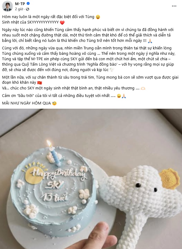 Một lần nữa, với sự chân thành từ sâu trong trái tim, Tùng mong bà con sẽ sớm vượt qua được giai đoạn khó khăn này. Và… chúc cho SKY một ngày sinh nhật thật bình an, thật nhiều yêu thương… Cảm ơn “bầu trời” của tôi vì tất cả những điều tuyệt vời nhất."
