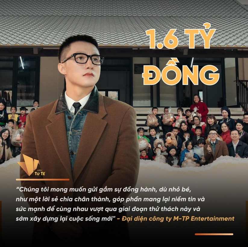 Được biết, Sơn Tùng M-TP và công ty quản lý M-TP Entertainment ủng hộ 700 triệu đồng thông qua Quỹ Tấm lòng Việt. Hồi tháng 10 vừa qua, nam ca sĩ cũng ủng hộ 1,6 tỷ đồng giúp đỡ bà con chịu ảnh hưởng của thiên tai.
