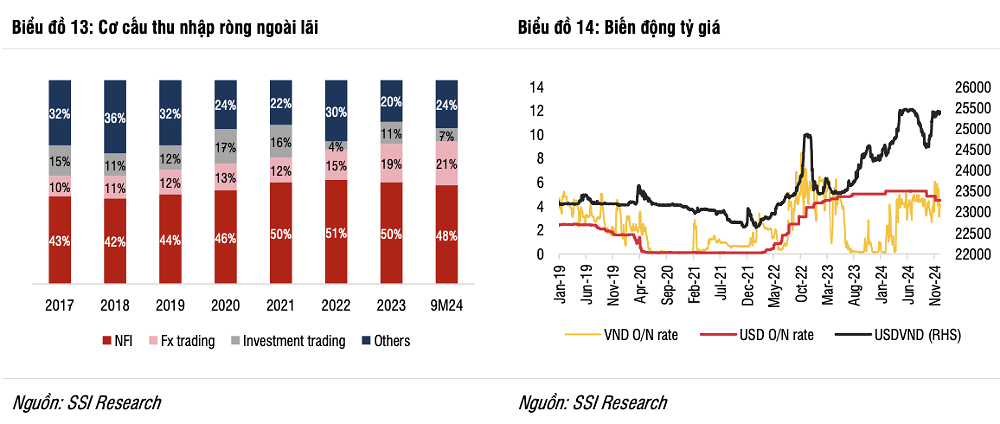 Tuy nhiên, mức tăng này giảm 39,5% trong quý III/2024 khi đồng USD suy yếu do kỳ vọng Fed sẽ cắt giảm lãi suất. SSI dự báo thu nhập từ giao dịch ngoại hối sẽ phục hồi trở lại trong quý IV/2024 nhờ tỷ giá hối đoái được cải thiện.