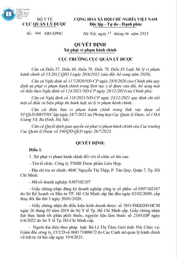Căn cứ Nghị định số 118/2021/NĐ-CP ngày 23/12/2021 quy định chi tiết một số điều và biện pháp thi hành luật xử lý vi phạm hành chính; Căn cứ Biên bản vi phạm hành chính trong lĩnh vực dược số 92/QLD-BBVPHC lập ngày 28/7/2023 tại Phòng họp Cục Quản lý Dược, số 138A Giảng Võ, Ba Đình, Hà Nội; Căn cứ Quyết định giao quyền xử phạt vi phạm hành chính của Cục trưởng Cục Quản lý Dược số 540/QĐ-QLD ngày 26/7/2023.