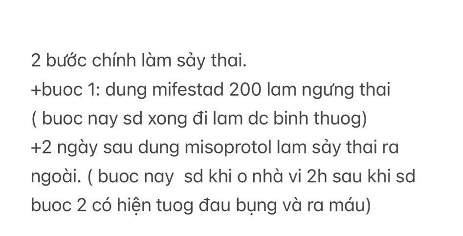 Khi được hỏi liệu trình và đơn thuốc để sử dụng thì người bán tư vấn: “Cả một đơn thuốc sẽ gồm 2 bước: Bước 1 dùng mifestad 200 làm ngưng thai (bước này sử dụng xong đi làm bình thường). Hai ngày sau dùng misoproton làm sảy thai ra ngoài. Bước này sử dụng khi ở nhà vì sau khi sử dụng bước 2 thì 2h sau có hiện tượng đau bụng và ra máu”.