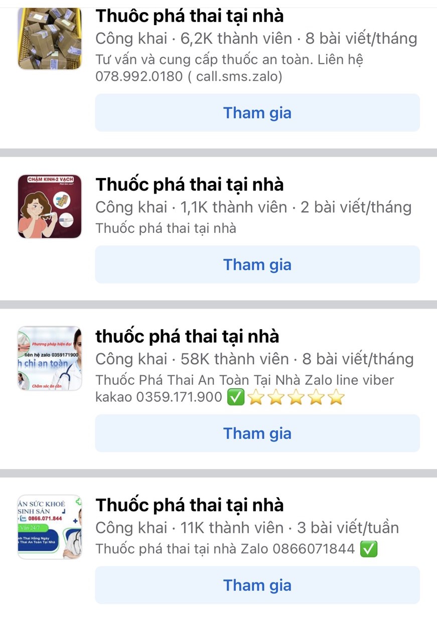 Tuy nhiên, theo tìm hiểu của phóng viên, thuốc phá thai vẫn được bán rất công khai trên mạng xã hội với giá cực rẻ, dễ mua và dễ sử dụng. Lên mạng gõ từ khóa “mua thuốc phá thai tại nhà” sẽ cho ra hàng nghìn kết quả, từ các trang Facebook cá nhân, Fanpage công khai mua bán.