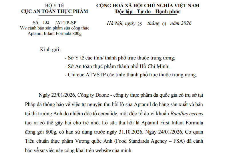 Chiều 25/1, Bộ Y tế phát đi văn bản khẩn yêu cầu các địa phương rà soát, kiểm tra và tuyên truyền để người dân không sử dụng sản phẩm sữa công thức Aptamil Infant Formula 800g do có nguy cơ ảnh hưởng đến sức khỏe trẻ nhỏ. Văn bản được ban hành sau khi Cục An toàn thực phẩm tiếp nhận thông tin về việc Tập đoàn Danone (Pháp) tự nguyện thu hồi một lô sữa Aptamil First Infant Formula tại thị trường Anh vì phát hiện nguy cơ nhiễm độc tố cereulide.