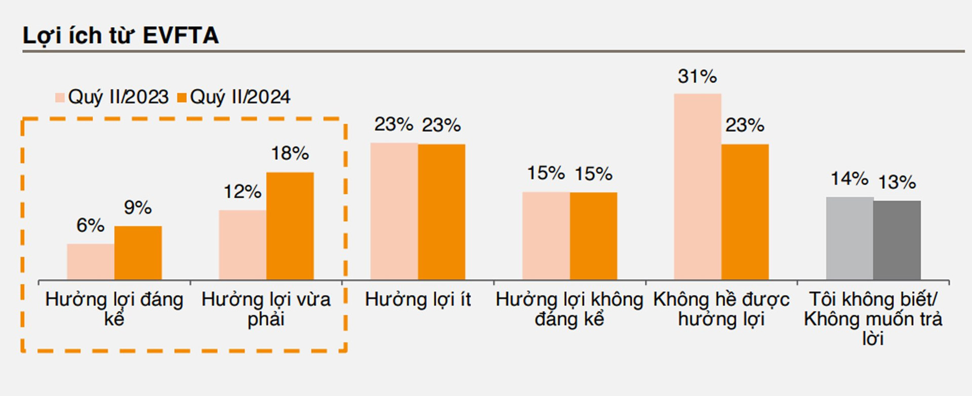 Kết quả khảo sát cho thấy, 2/3 số người tham gia khảo sát cho rằng, họ đã nhận được lợi ích, tuy nhiên ở những mức độ khác nhau. Đáng chú ý, số lượng doanh nghiệp được hưởng lợi từ trung bình đến đáng kể từ hiệp định đã tăng hơn 10 điểm phần trăm so với cùng kỳ năm trước, với 27% doanh nghiệp báo cáo tác động tích cực trong năm nay (hiện đang nhận được những lợi ích từ mức độ vừa đến rất lớn), tăng đáng kể so với 18% của năm ngoái, trong khi số doanh nghiệp chưa thấy lợi ích giảm so với 31% vào năm 2023 xuống còn 1/4.