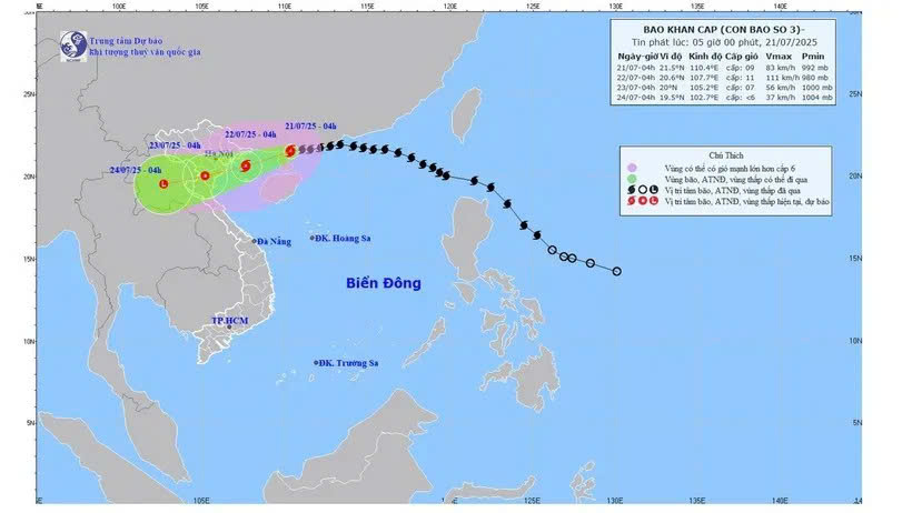 Sáng 21/7, bão số 3 di chuyển theo hướng Tây Tây Nam, tốc độ khoảng 15 - 20km/giờ, chỉ còn cách Quảng Ninh - Hải Phòng khoảng 233km về phía Đông. Dự báo chiều tối nay, bão sẽ vào vịnh Bắc Bộ; vùng ven biển từ Quảng Ninh đến Nghệ An có gió mạnh dần lên cấp 7 - 9; đồng bằng Bắc Bộ, Thanh Hóa và Nghệ An có mưa rất to và dông.