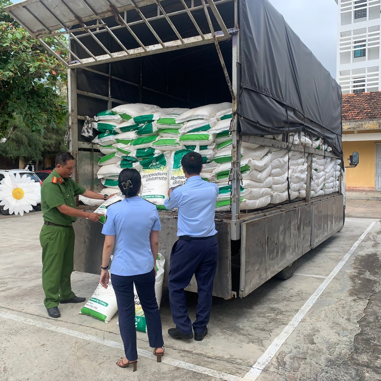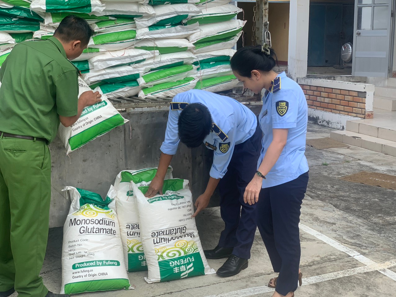 Đoàn công tác phát hiện trên xe đang vận chuyển gần 10 tấn bột ngọt (loại bao 25 ký) trên bao bì in sản xuất bởi Fufeng, nước sản xuất Trung Quốc. Toàn bộ số bột ngọt trên được in nhãn gốc trên bao bì bằng tiến nước ngoài nhưng không có nhãn phụ bằng tiếng Việt Nam theo quy định của pháp luật.