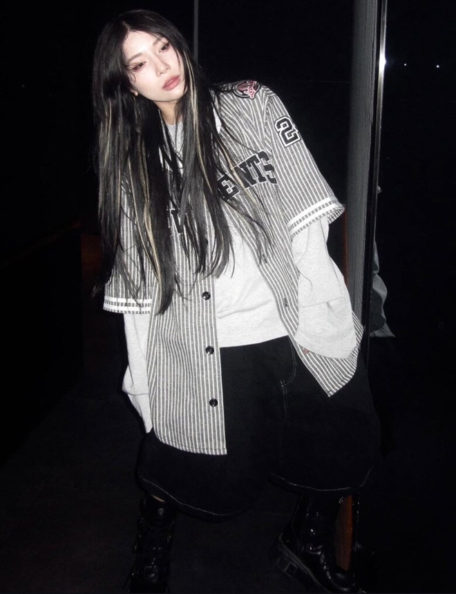 LyHan thể hiện phong cách thời trang dark streetwear đậm chất cá tính và phá cách. Cô diện áo thun oversized phối cùng áo khoác dáng rộng mang hơi hướng bóng chày (baseball jersey), kết hợp quần shorts đen rộng và boots da hầm hố. Tông màu chủ đạo là đen – xám – trắng, tạo nên tổng thể mạnh mẽ, bí ẩn và có phần lạnh lùng.