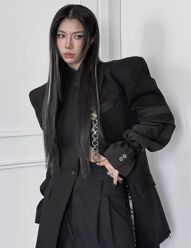 Nữ ca sĩ gen Z gây ấn tượng mạnh với phong cách all-black tối giản nhưng quyền lực, mang đậm tinh thần avant-garde và thời trang phi giới tính. Cô diện blazer dáng rộng với cầu vai cấu trúc sắc nét – chi tiết gợi nhắc tới phong cách power dressing của thập niên 80 nhưng được làm mới theo hơi hướng hiện đại.