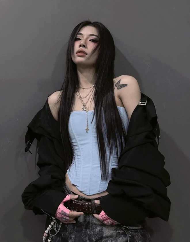 Chiếc áo corset xanh baby tôn dáng gợi cảm, mang hơi thở cổ điển được LyHan phối đầy ngẫu hứng cùng quần jeans bạc màu, găng tay hồng đính đá và thắt lưng đinh tán. Khoác ngoài là áo khoác oversized đen tạo nên sự đối lập về phom dáng và màu sắc, góp phần tăng chiều sâu cho tổng thể trang phục.
