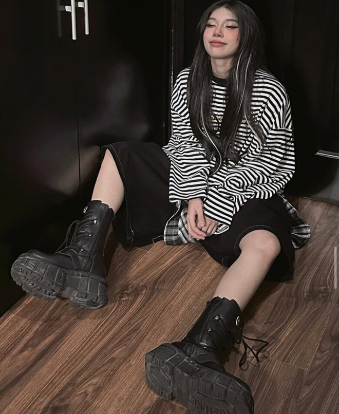 Outfit của LyHan mang đậm hơi thở grunge pha chút streetwear cá tính với áo thun kẻ sọc oversized phối layer sơ mi caro – combo kinh điển của phong cách thập niên 90 nhưng được "refresh" nhờ quần lửng rộng và đôi combat boots hầm hố.