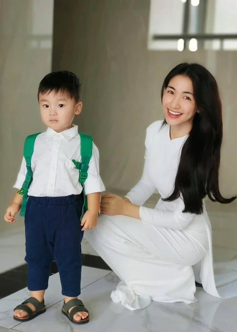 Trong hình, có thể thấy, bé Bo lũn chũn ngày nào giờ đã ra dáng học sinh lớp 1. Quý tử được khen đẹp trai, ngày càng trổ mã, khôi ngô.