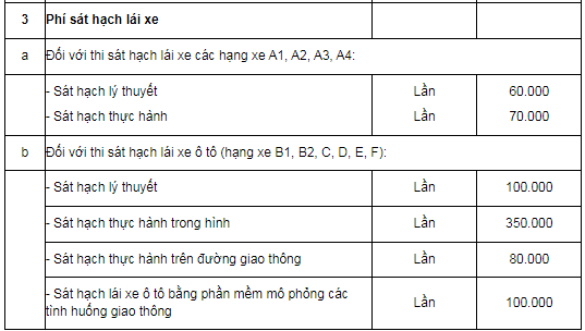 Tăng 40 nghìn đồng đối với thi sát hạch lái xe các hạng xe A1, A2, A3, A4. Trong đó, sát hạch lý thuyết tăng 20 nghìn đồng lên 60 nghìn đồng; sát hạch thực hành tăng 20 nghìn đồng lên 70 nghìn đồng.