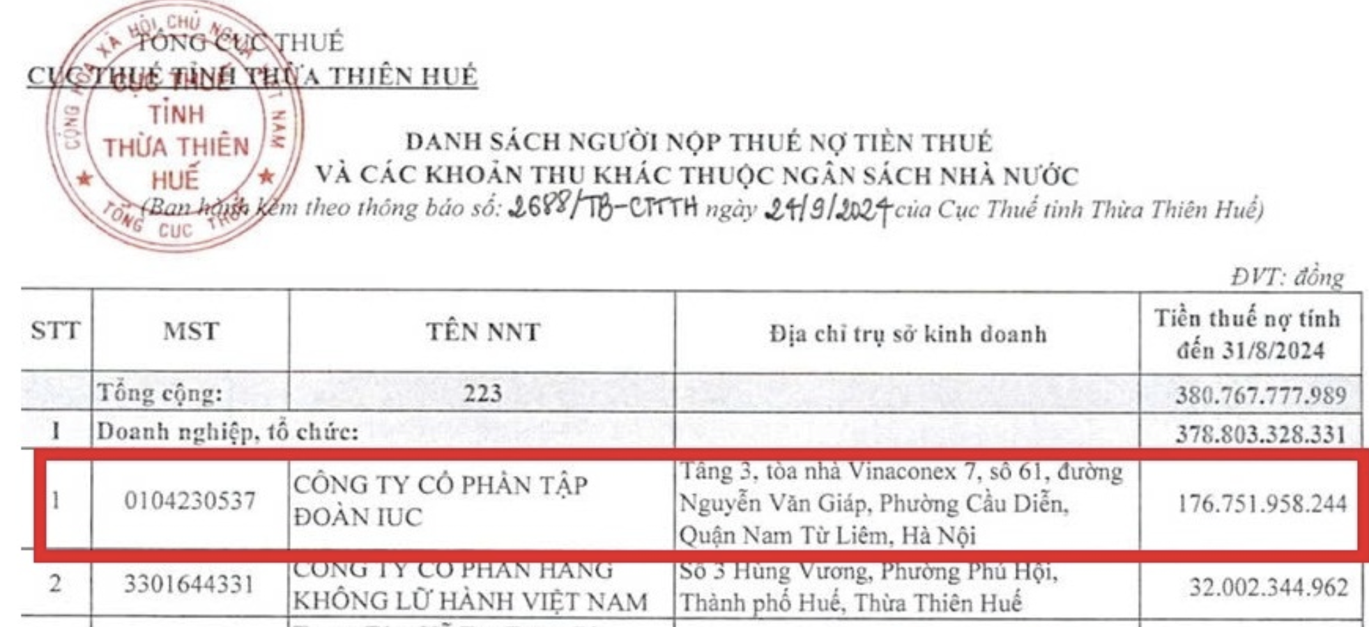 Ngoài Công ty Cổ phần Tập đoàn IUC, Cục Thuế tỉnh Thừa Thiên Huế cũng thực hiện công khai thông tin 222 người nộp thuế còn nợ tiền thuế và các khoản thu khác thuộc ngân sách nhà nước tính đến thời điểm 31/08/2024 với tổng số tiền là 380.767.777.989 đồng…