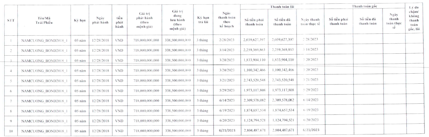 Theo báo cáo tình hình thanh toán gốc lãi bán niên năm 2023, lô trái phiếu NAMCUONG_BOND2018_1 do Nam Cường phát hành có kỳ hạn 5 năm, ngày phát hành là 28/12/2018, như vậy sẽ đáo hạn vào 28/12/2023. Giá trị phát hành ban đầu của lô trái phiếu này là 718 tỷ đồng. Nửa đầu năm nay, Tập đoàn Nam Cường đã thanh toán hơn 20 tỷ đồng tiền lãi của lô trái phiếu này.