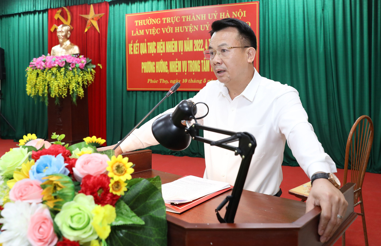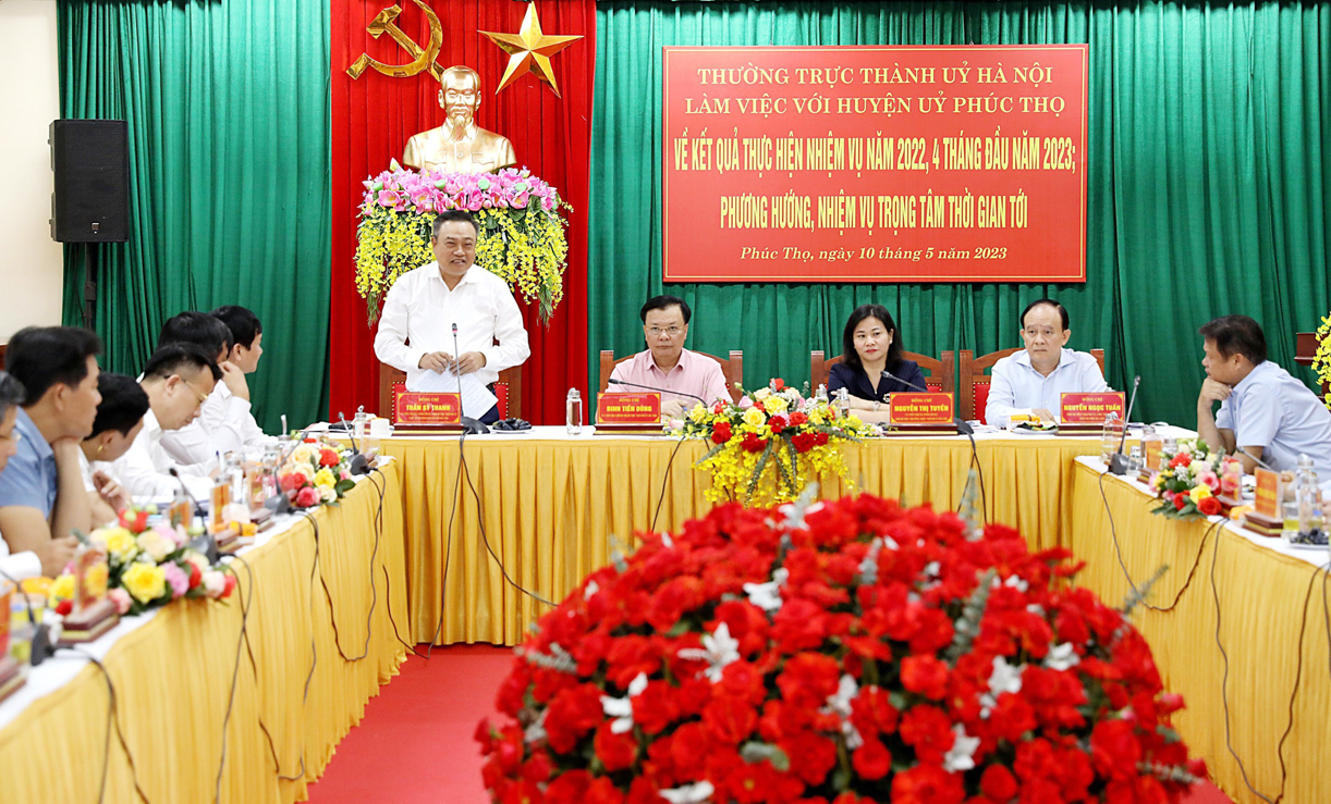 Ngày 10/5, Thường trực Thành uỷ Hà Nội làm việc với Huyện ủy Phúc Thọ về kết quả thực hiện nhiệm vụ năm 2022, quý I/2023 và nhiệm vụ trọng tâm thời gian tới.