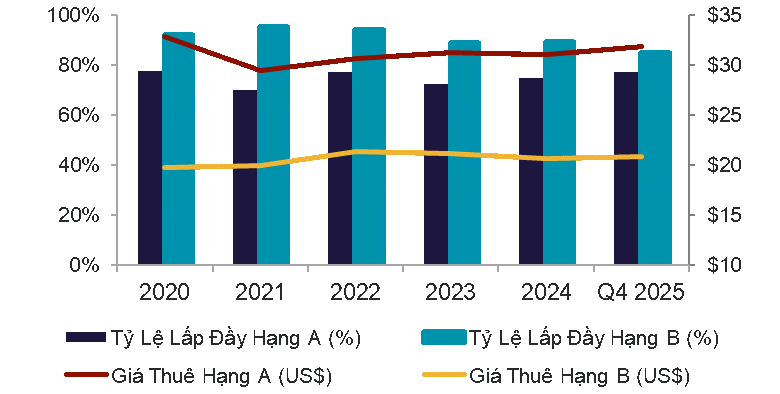 Việc giá thuê Hạng B điều chỉnh trong quý chủ yếu do lượng lớn nguồn cung mới gia nhập thị trường, thúc đẩy chủ tòa nhà đưa ra chiến lược cho thuê linh hoạt hơn như giảm giá hoặc tăng ưu đãi để duy trì tỷ lệ lấp đầy trong bối cảnh cạnh tranh gia tăng.