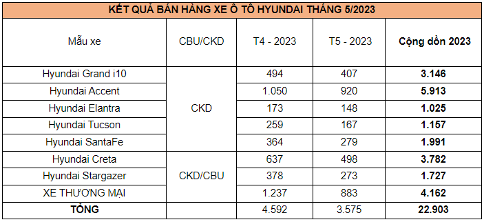Ngày 12/06/2023, Tập đoàn Thành Công (TC GROUP) thông báo kết quả bán hàng tháng 5/2023. Theo đó, tổng doanh số xe Hyundai tháng 5 đạt 3.575 xe.