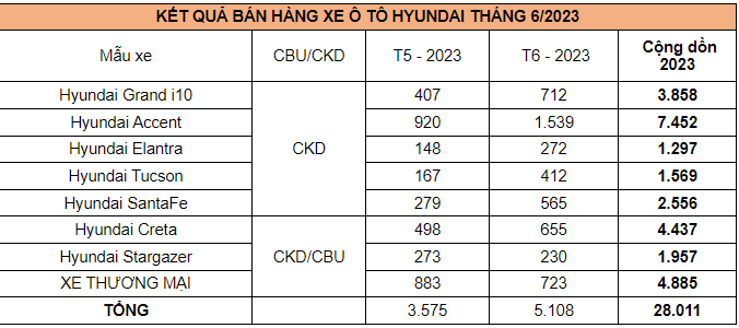 Ngày 12/07, Tập đoàn Thành Công (TC GROUP) thông báo kết quả bán hàng tháng 6/2023. Theo đó, tổng doanh số xe Hyundai tháng 6 đạt 5.108 xe, tăng trưởng 42,9% so với tháng 5.