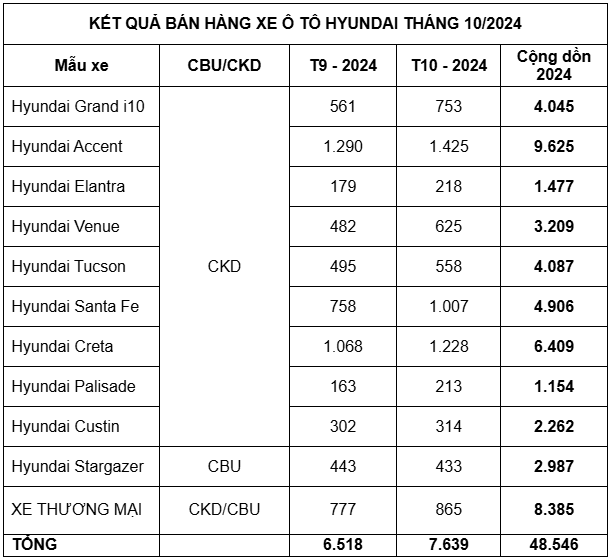 Tập đoàn Thành Công (TC GROUP) vừa thông báo kết quả bán hàng ô tô Hyundai tháng 10/2024. Theo đó, tổng doanh số xe Hyundai tháng 10 đạt 7.639 xe bán ra, tăng trưởng 17,2% so với tháng 9.