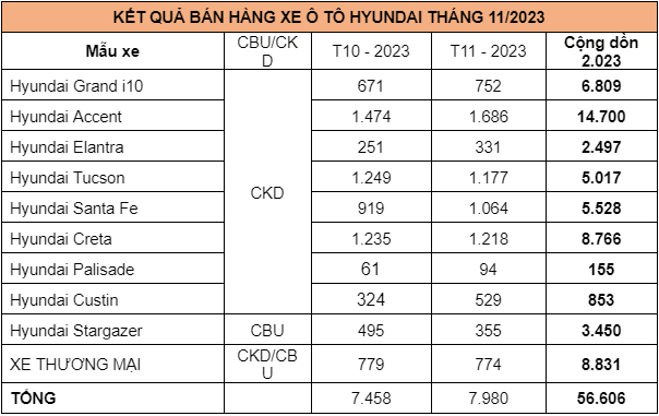 Doanh số bán hàng các mẫu xe Hyundai trong tháng 11/2023 (Đơn vị: Xe)