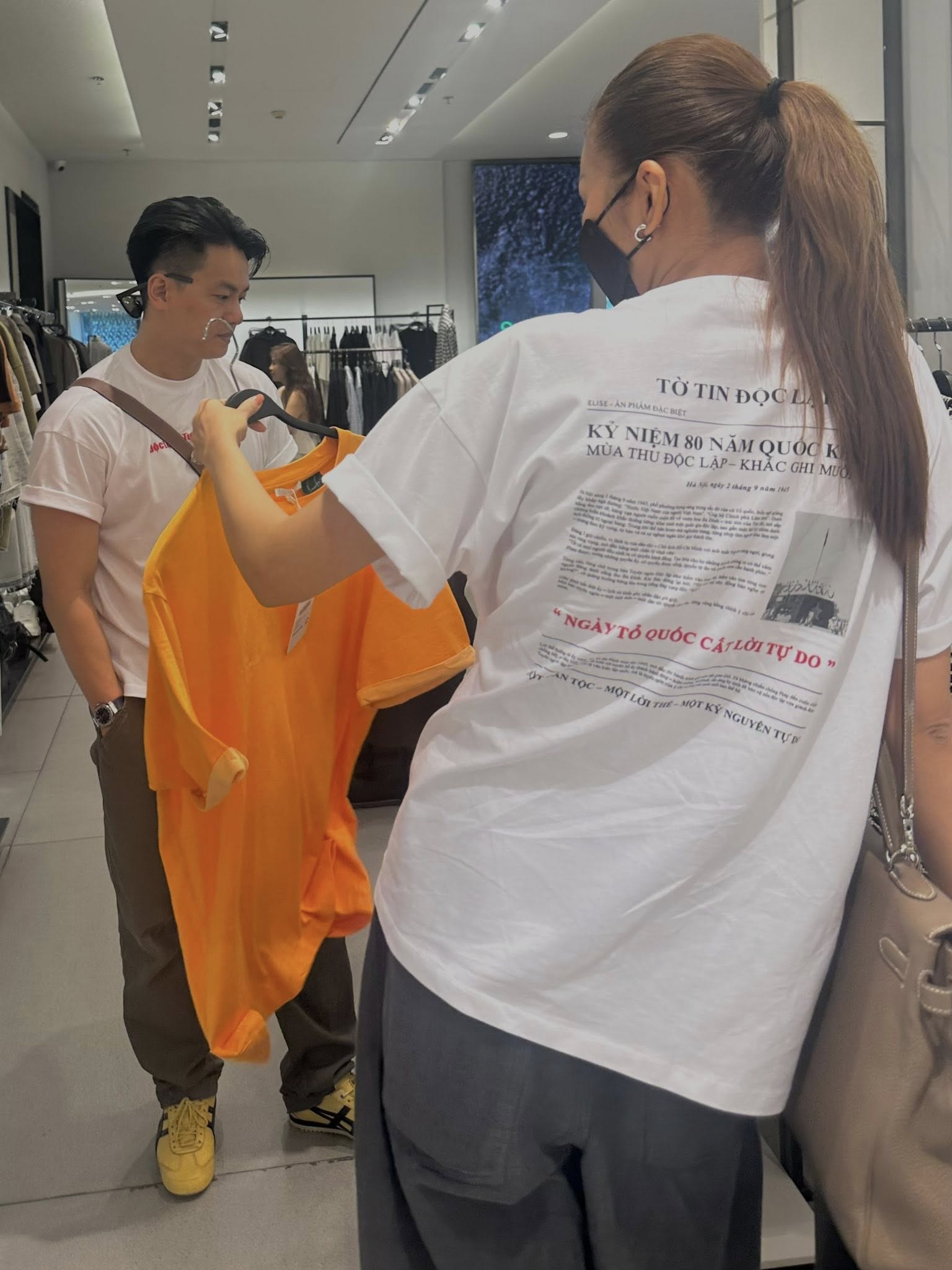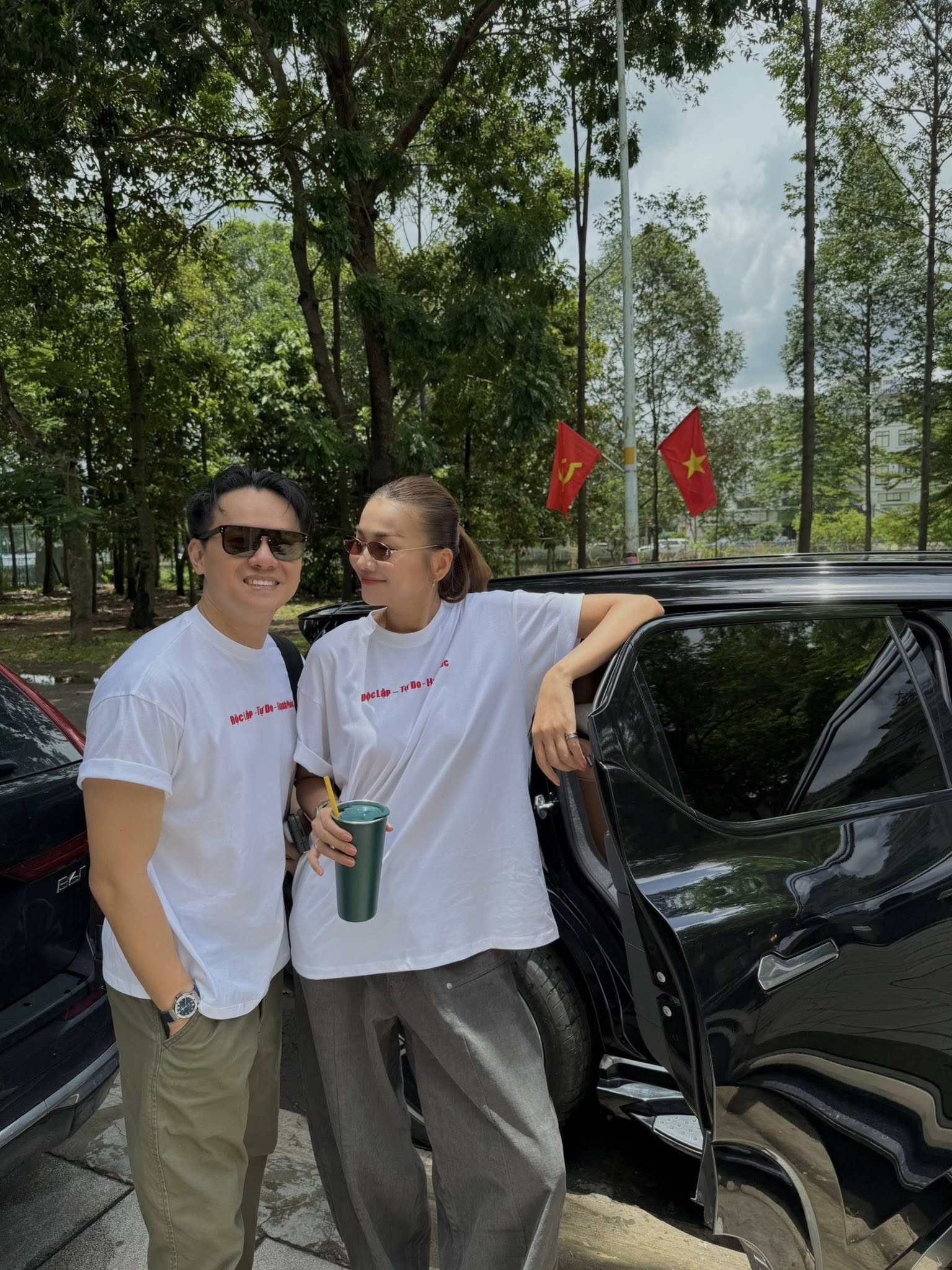 Hòa chung trong không khí cả nước hướng về đại lễ 80 năm kỉ niệm Quốc khánh 2/9, siêu mẫu cùng ông xã diện áo đôi có in chữ "Độc lập - Tự do - Hạnh phúc" xuống phố check-in.