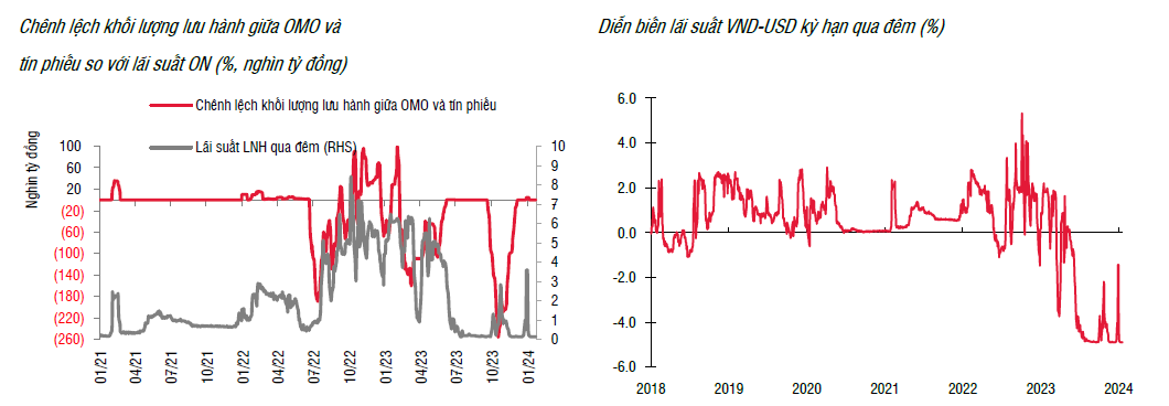 Khác với xu hướng tích cực thường thấy vào đầu năm, áp lực đối với tỷ giá hiện nay đang cao dần, một phần do thị trường đang đánh giá lại khả năng giảm lãi suất của FED, chưa kể tới chênh lệch lãi suất VND-USD âm kéo dài khiến áp lực rút vốn tăng dần. Bên cạnh đó, cán cân thương mại cũng khó có khả năng hỗ trợ tích cực như giai đoạn 2023, và những số liệu XNK đầu tháng 1 đã thể hiện xu hướng này khi nhập khẩu tăng mạnh hơn xuất khẩu khá nhiều. Bên cạnh đó, chênh lệch giữa giá vàng trong nước và quốc tế vẫn chưa có sự cải thiện rõ rệt và khiến biến động tỷ giá trên thị trường tự do khó lường hơn.