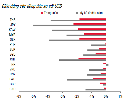 Đồng USD, đo lường thông qua chỉ số DXY tăng mạnh (+1% so với cuối tuần trước đó) và các đồng tiền chủ chốt đều giảm mạnh so với USD như JPY (-2,2%), EUR (-0,5%) ha GBP (-0,4%). Tương tự, các đồng tiền trong khu vực Châu Á hầu hết đều giảm mạnh so với USD như KRW (-1,9%), THB (-1,8%).