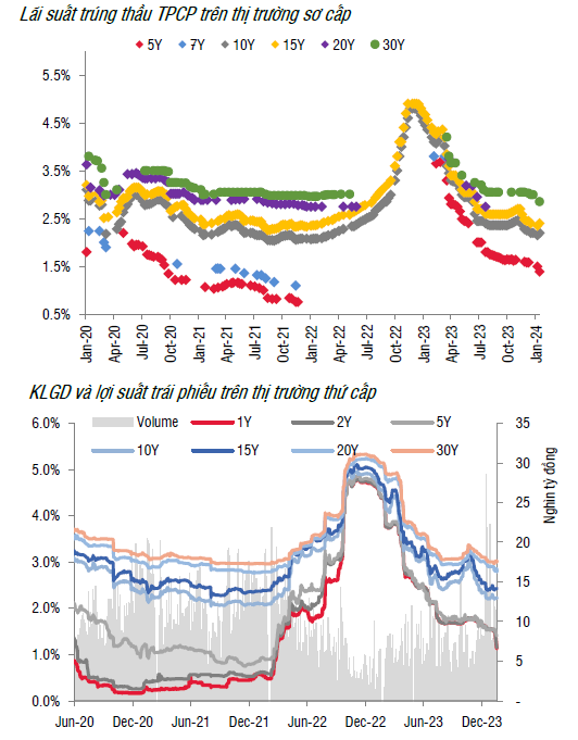 KBNN đã công bố kế hoạch phát hành TPCP Quý 1/2024 với tổng khối lượng phát hành là 127 nghìn tỷ, tăng 10% so với cùng kỳ. Đáng chú ý, KBNN đẩy mạnh kế hoạch phát hành kỳ hạn 5 năm (tổng 25 nghìn tỷ, tăng hơn 200% so với cùng kỳ) và giảm kế hoạch cho kỳ hạn 7, 20 và 30 năm. Kế hoạch phát hành cho kỳ hạn 10 và 15 năm vẫn chiếm tỷ trọng lớn nhất, lần lượt là 30 và 50 nghìn tỷ. Tính đến hiện tại, KBNN đã huy động được 7% kế hoạch Quý.