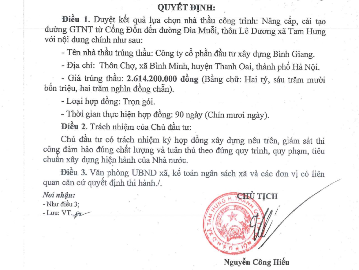 Còn tại xã Tam Hưng ngày 16/07/2024, ông Nguyễn Công Hiếu chủ tịch UBND xã ký quyết định phê duyệt dự án nâng cấp, cải tạo đường GTNT từ Cổng Đồn đến đường Đìa Muỗi, thôn Lê Dương xã Tam Hưng, với giá 2.624.473.000 VND, Công ty Bình Giang tham gia và trúng với giá 2.614.200.000 VND tiết kiệm cho ngân sách 10.273.000 VND.