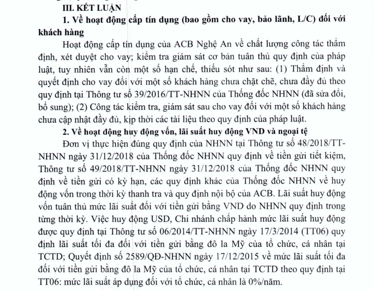Kết luận thanh tra nêu rõ, hoạt động cấp tín dụng của ACB Nghệ An về chất lượng công tác thẩm định, xét duyệt cho vay; kiểm tra giám sát cơ bản tuân thủ quy định của pháp luật, tuy nhiên, vẫn còn một số hạn chế, thiếu sót.