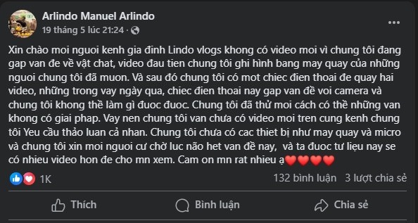 Chia sẻ gây chú ý trước đó của Lindo về công việc làm Youtube.