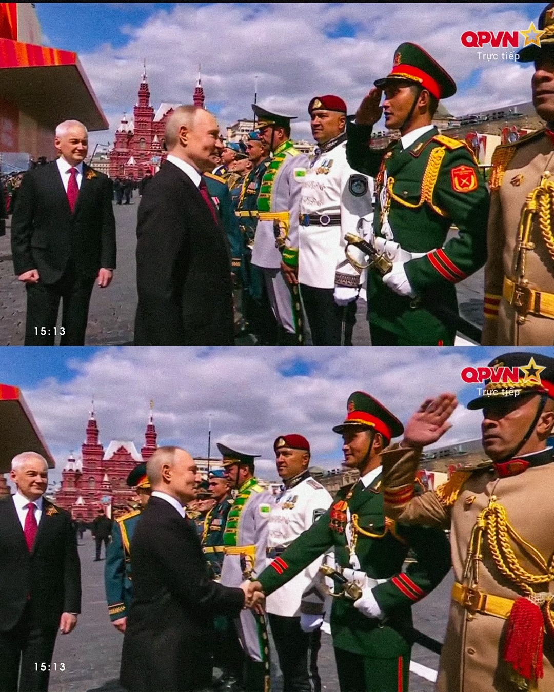 Đặc biệt, khoảnh khắc Trung tá Phạm Khắc Giang SN 2000, quê Bắc Ninh, công tác tại Trường Sĩ Quan Lục Quân 1 được vinh dự bắt tay Tổng thống Nga Putin khiến mạng xã hội phát sốt (Nguồn: QPVN).