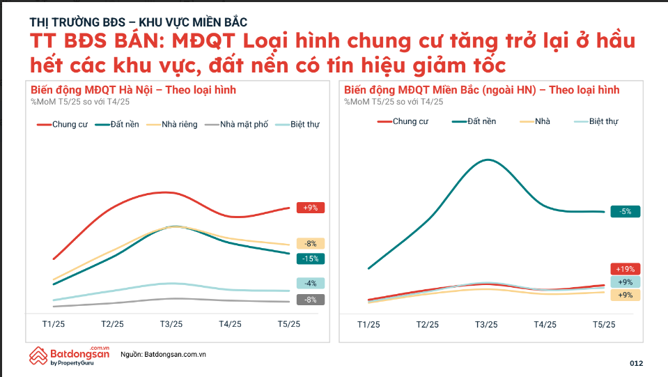 Dữ liệu tháng 5/2025 từ Batdongsan.com.vn cho thấy diễn biến trái chiều giữa các phân khúc bất động sản tại miền Bắc. Trong khi chung cư tiếp tục dẫn sóng phục hồi, thì đất nền đang có dấu hiệu giảm tốc rõ nét – đặc biệt tại Hà Nội và các tỉnh vệ tinh.