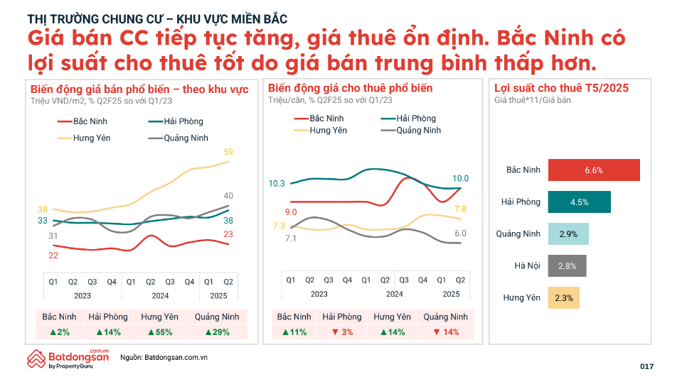 Không chỉ phục hồi về lượng quan tâm, thị trường chung cư miền Bắc còn ghi nhận xu hướng tăng giá rõ rệt trong 5 năm qua. Trong đó, Hà Nội và Hưng Yên đang dẫn đầu về nguồn cung phân khúc cao cấp, trong khi Bắc Ninh lại nổi bật về lợi suất cho thuê nhờ mặt bằng giá còn thấp.