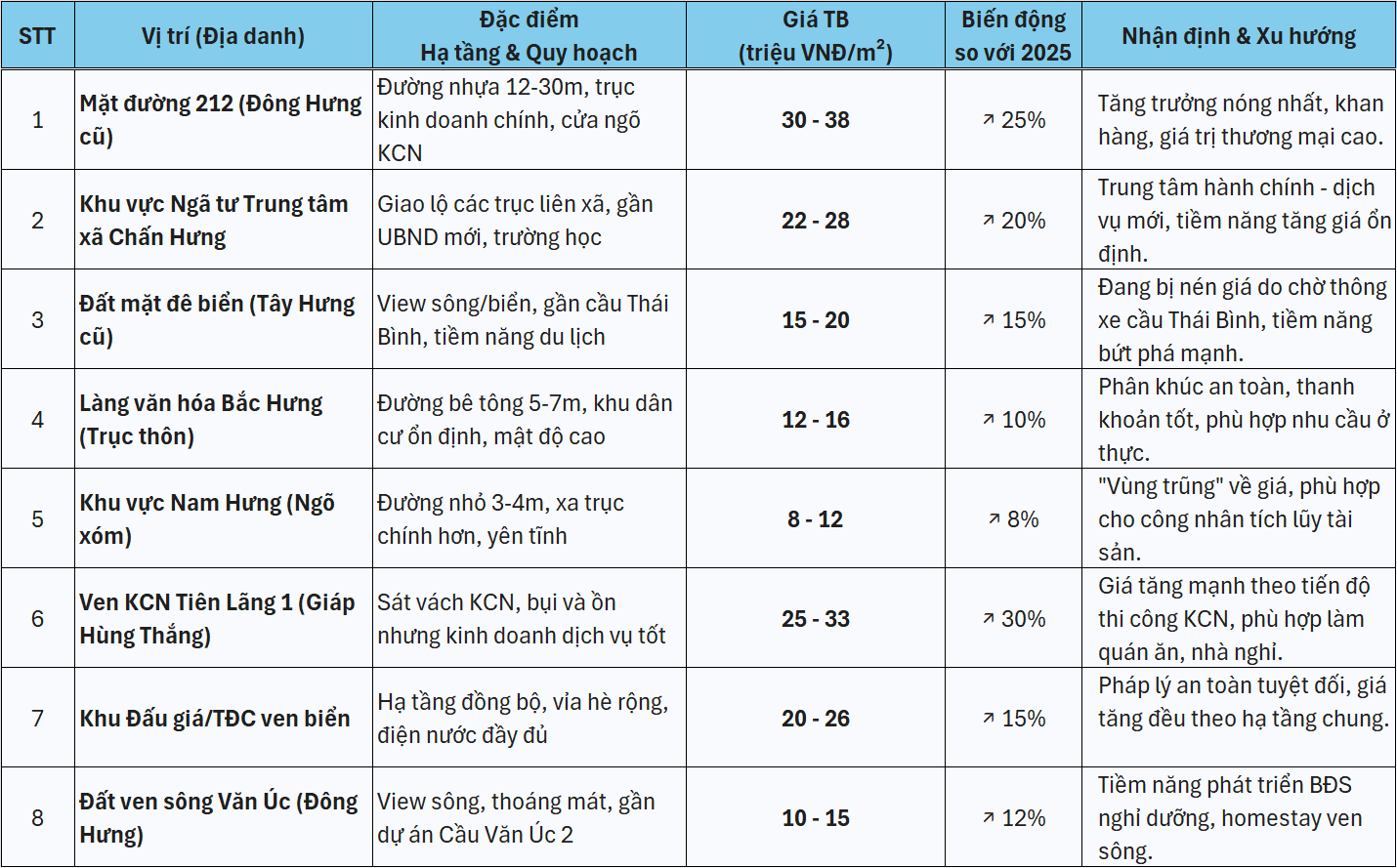 Sự chênh lệch giá giữa vị trí số 1 (38 triệu) và số 5 (8 triệu) cho thấy sự phân hóa sâu sắc. Giá BĐS tại xã Chấn Hưng giờ đây được định đoạt bởi khả năng sinh lời thương mại (dòng tiền) hơn là giá trị tích lũy tài sản đơn thuần. Khu vực Tây Hưng (vị trí 3) đang là một "ẩn số", hiện tại giao dịch còn trầm lắng do chờ đợi hạ tầng kết nối, nhưng khi cầu Thái Bình thông xe, đây sẽ là khu vực có biên độ tăng giá tốt nhất nhờ hiệu ứng "đuổi kịp" giá các khu vực khác.