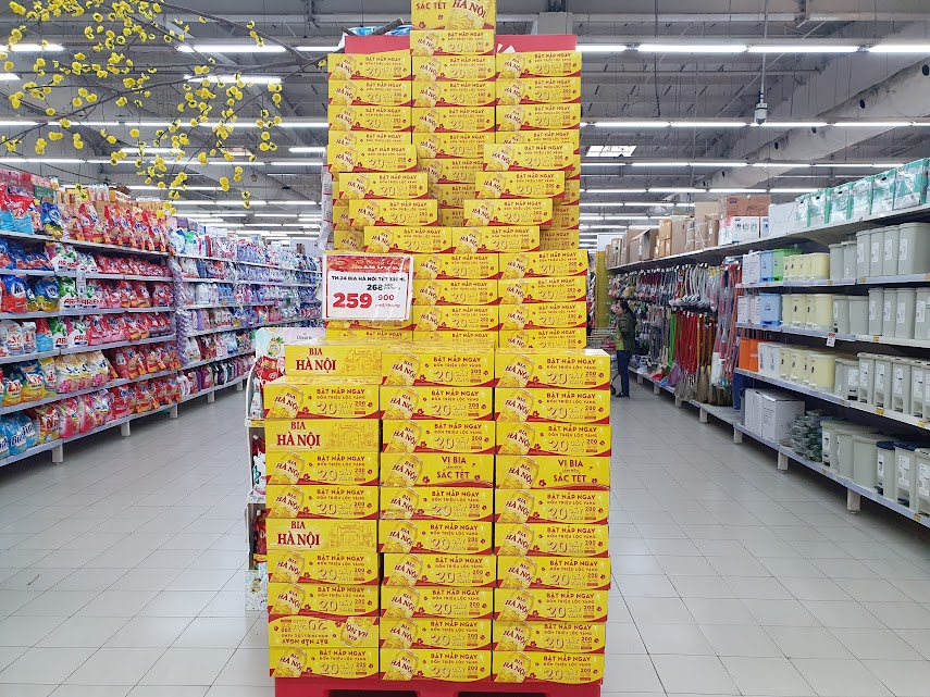 Theo ghi nhân của phóng viện, tại các siêu thị, cửa hàng tạp hoá ở Hà Nội, đủ các loại bia của các thương hiệu, mẫu mã đã ngập tràn khắp các lối đi và chất thành từng khối cao.