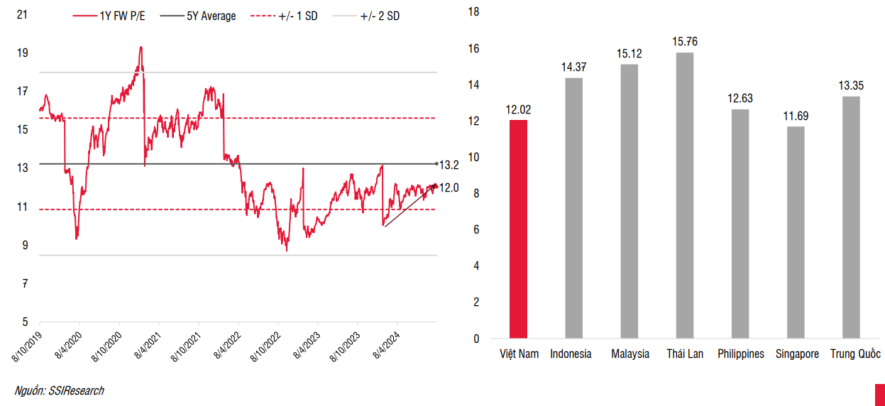 P/E ước tính 1 năm của VN-Index tăng lên 12 lần vào ngày 04/10/2024, cao nhất từ cuối tháng 1/2024, phản ánh kỳ vọng tăng trưởng lợi nhuận cho giai đoạn nửa cuối 2024 và năm 2025. Dù vậy, định giá thị trường Việt Nam vẫn thấp hơn so với một số thị trường khu vực Đông Nam Á, một trong các điểm mấu chốt để cạnh tranh thu hút trở lại dòng vốn ngoại.