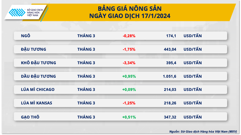 Đối với thị trường nông sản, kết thúc ngày giao dịch 17/1, giá đậu tương lao dốc với mức giảm mạnh 1,75%. Chuỗi giảm giá liên tiếp đã đẩy giá xuống mức thấp nhất kể từ đầu tháng 11/2021. Những dự báo kém tích cực về mùa vụ Brazil từ các hãng tin không còn đem lại nhiều bất ngờ cho thị trường và hỗ trợ giá. Thay vào đó, tình hình thời tiết ở các khu vực nông nghiệp của quốc gia Nam Mỹ này đang dần cải thiện hơn là yếu tố gây sức ép mạnh lên giá. Ngoài ra, đồng USD mạnh lên, nhu cầu yếu hơn tại Trung Quốc cũng góp phần tác động đến giá mặt hàng này.