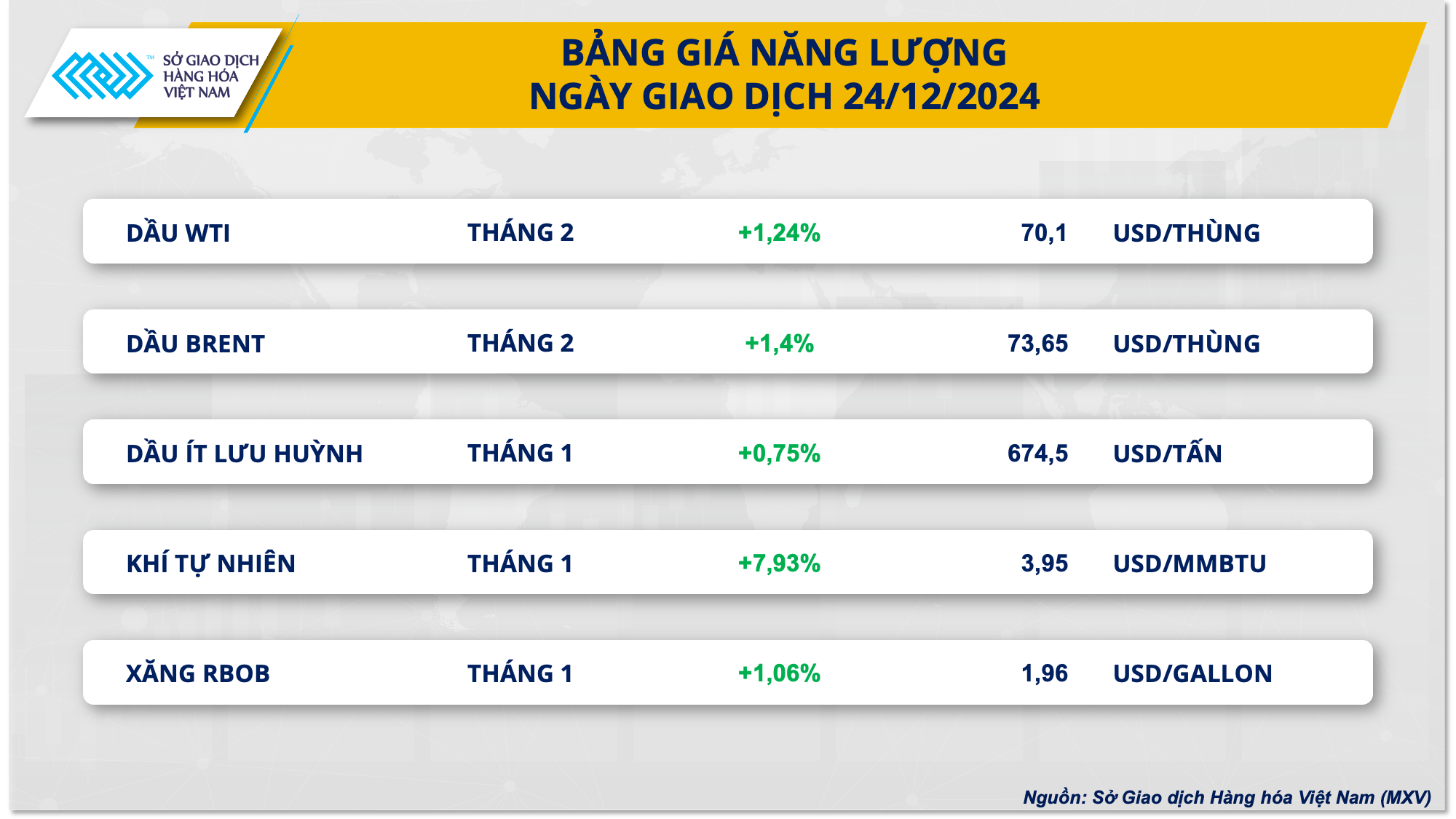 Phiên giao dịch ngày hôm qua kết thúc sớm để các Sở Giao dịch lớn trên thế giới nghỉ lễ Giáng sinh. Ghi nhận mức giá đóng cửa vào khoảng 2h sáng ngày 25/12 giờ Việt Nam, giá dầu thô Brent đi lên 1,4%, đạt 73,65 USD/thùng, trong khi đó, giá dầu thô WTI cũng tăng 1,24% lên 70,1 USD/thùng.