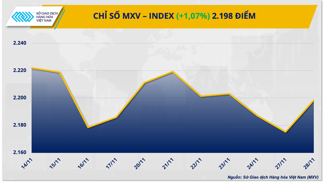 Số liệu từ Sở Giao dịch hàng hóa Việt Nam (MXV) cho thấy lực mua áp đảo trên thị trường hàng hoá nguyên liệu trong ngày 28/11. Sau 3 phiên liên tiếp giá dầu đi xuống, hôm qua, giá mặt hàng bật tăng trở lại hơn 2% do nguồn cung tại Kazakhstan bị ảnh hưởng vì bão đổ bộ vào biển Đen.