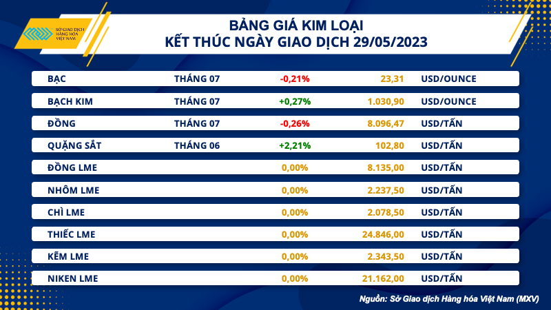 Trên thị trường kim loại, giá đồng COMEX giảm 0,26% xuống 3,67 USD/pound. Giá đồng tăng khá mạnh trong phiên sáng do được hưởng lợi từ những tiến bộ trong thỏa thuận trần nợ công. Tuy nhiên, triển vọng tiêu thụ của kim loại công nghiệp này vẫn còn mờ nhạt, khiến lực bán áp đảo trong phiên tối.