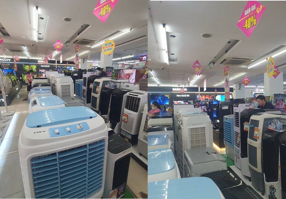 Tại các cửa hàng Điện Máy Xanh, nắm được dự đoán mùa hè năm nay đến sớm và oi ả hơn các năm trước nên các sản phẩm quạt điều hòa, quạt cây, quạt trần, quạt treo tường cũng được giảm giá 30 - 40%, các sản phẩm tủ lạnh cũng đua nhau giảm mạnh tới 46%.